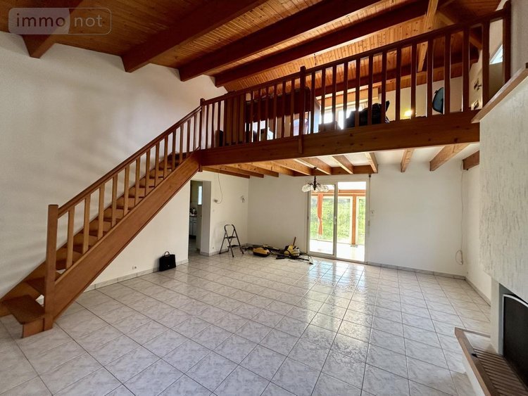 A l'étage : une entrée avec placard, une pièce de vie avec mezzanine et cheminée permettant d'accéder à la véranda, une cuisine séparée et aménagée, deux chambres avec placard, une salle de bains + douche avec placard et WC et un WC séparé avec lave-mains.