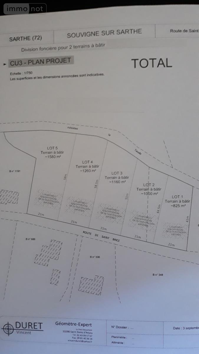 SOUVIGNE SUR SARTHE : Parcelle de terrain constructible non viabilisée - bordure de ruisseau - surface 825 m² - lot 1