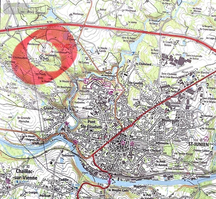 5 mn nord ouest du bourg de Saint Junien, terrain à bâtir de 1998 m² disposant des réseaux d'eau, d'électricité et d'assainissement collectif en façade.