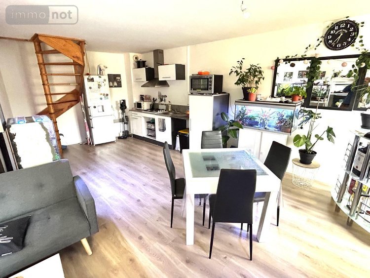 Ce bien de 66m² en duplex, vendu loué, se compose d'une entrée avec rangements, wc, d'un espace de vie (salon-séjour) et d'une cuisine ouverte de 30m².
