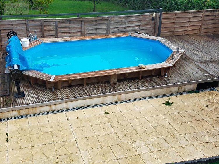 Terrasse sur le derrière avec piscine non enterrée.