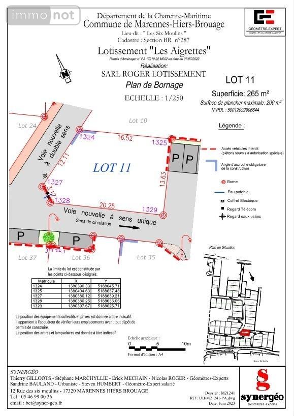 Terrain à bâtir (lot 11) à vendre Marennes-Hiers-Brouage en Charente-Maritime (17), Marennes, d'une surface de 265 m2 bornée et viabilisée, dans un lotissement de 37 lots dont 10 lots en logements aidés, proche du centre-ville et des commerces. Pour plus de renseignements nous consulter.