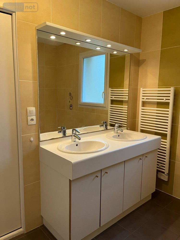 Entrée, pièce de vie avec cuisine aménagée et équipée, trois chambres avec placard, un bureau, salle de bain avec baignoire, douche, double vasque et placard, wc et lave-main, garage isolé