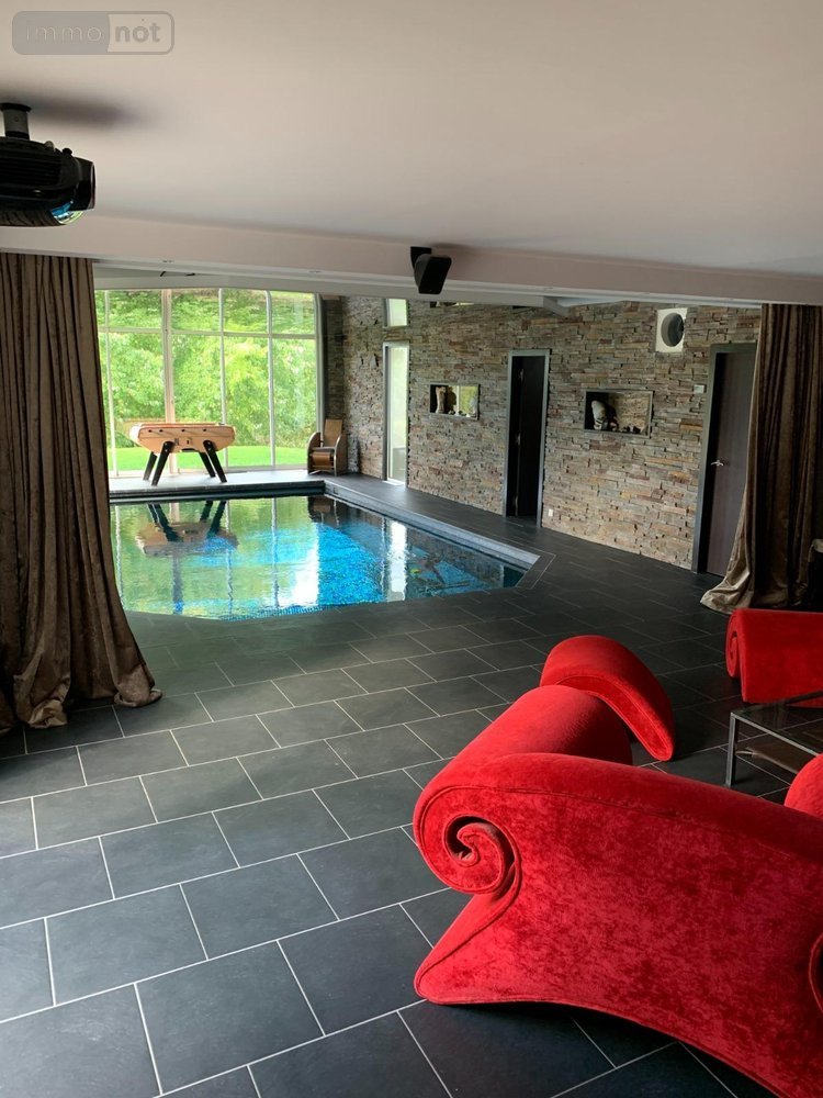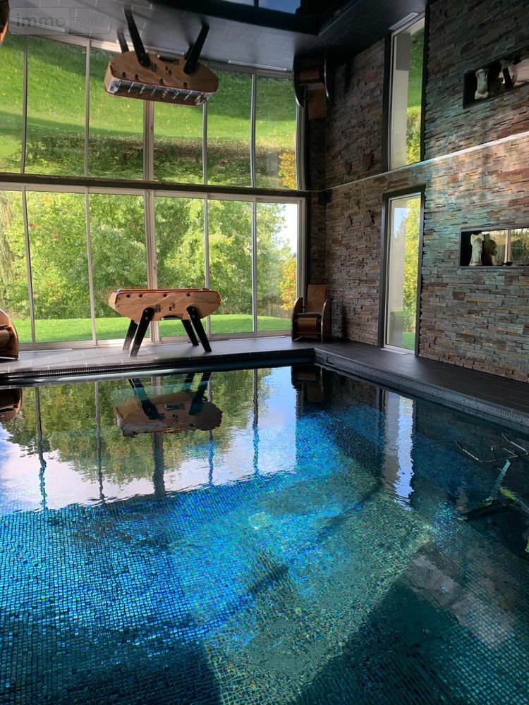 - au rez-de-chaussée : un hall d'entrée, cuisine ouverte sur séjour avec poêle de masse à bois ou granules TULIKIVI, toilettes, grande pièce faisant office de salle de sport avec piscine intérieure chauffée équipée d'une nage à contre courant, volet électrique de sécurité et home cinéma,