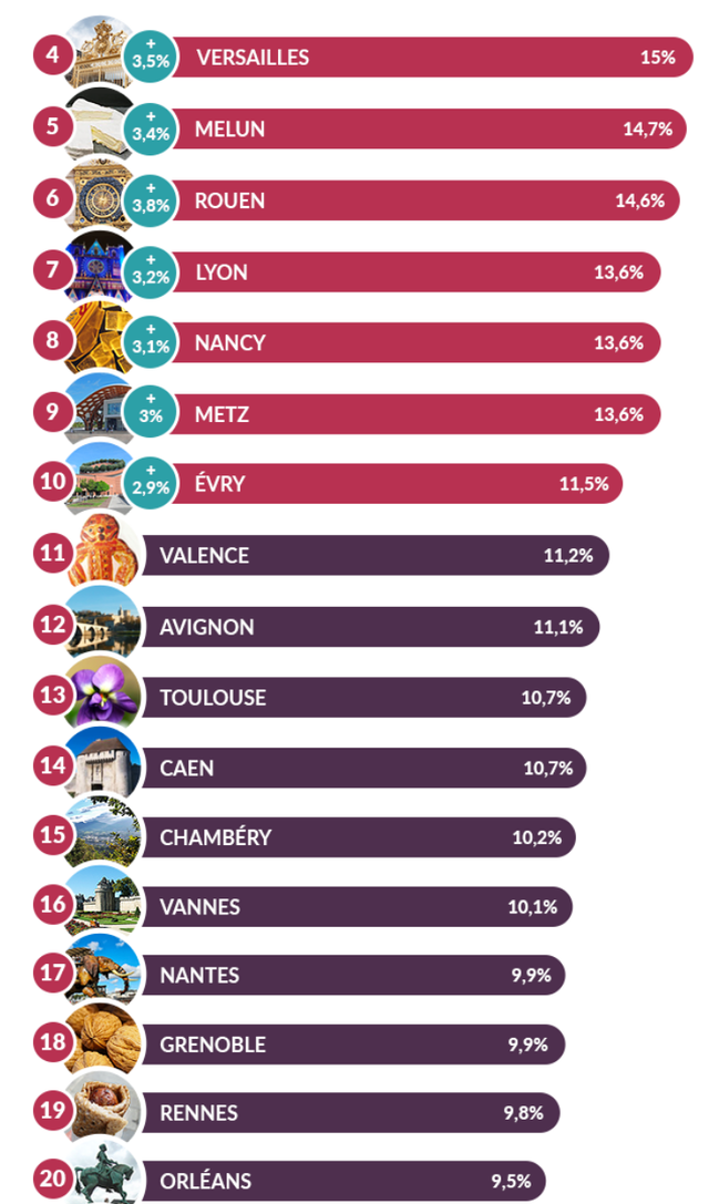 Que des grandes villes direz-vous… Et bien non ! Versailles se situe en 4e position du classement avec 15 % d'infidélité, suivie de Melun (14,7 %), soit 0,01 % de plus que Rouen, qui se hisse à la 6e place du classement.