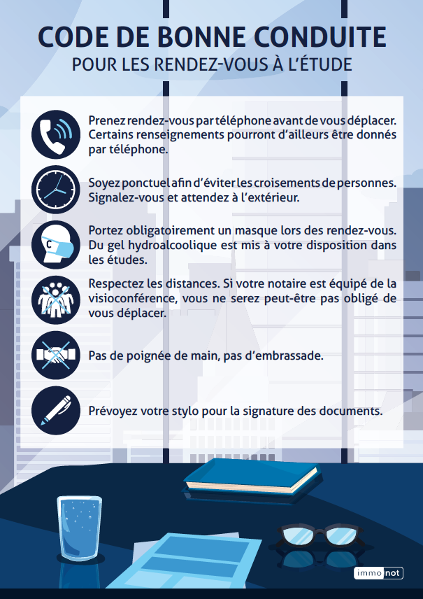 - Respectez les distances afin d'éviter un nombre trop important de personnes lors des signatures, il est possible d'établir des procurations. Si votre notaire est équipé de la visioconférence, vous ne serez pas obligé de vous déplacer.