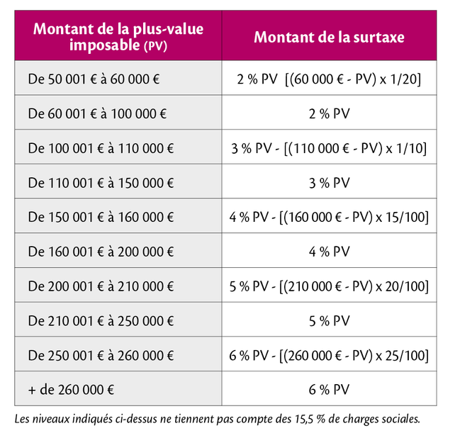 Donc, quand vous vendez un bien immobilier, sauf une résidence principale, à un prix supérieur à celui auquel vous l'avez acheté, vous réalisez une plus-value taxée à 34,50 %. À laquelle il faut ajouter, depuis le 1er janvier 2013, une surtaxe de 2 à 6 %, lorsque le gain généré est supérieur à 50 000 ?. Cette surtaxe s'applique sur la totalité de la plus-value après abattement, et bénéficie d'un système de lissage pour éviter les effets de seuils.