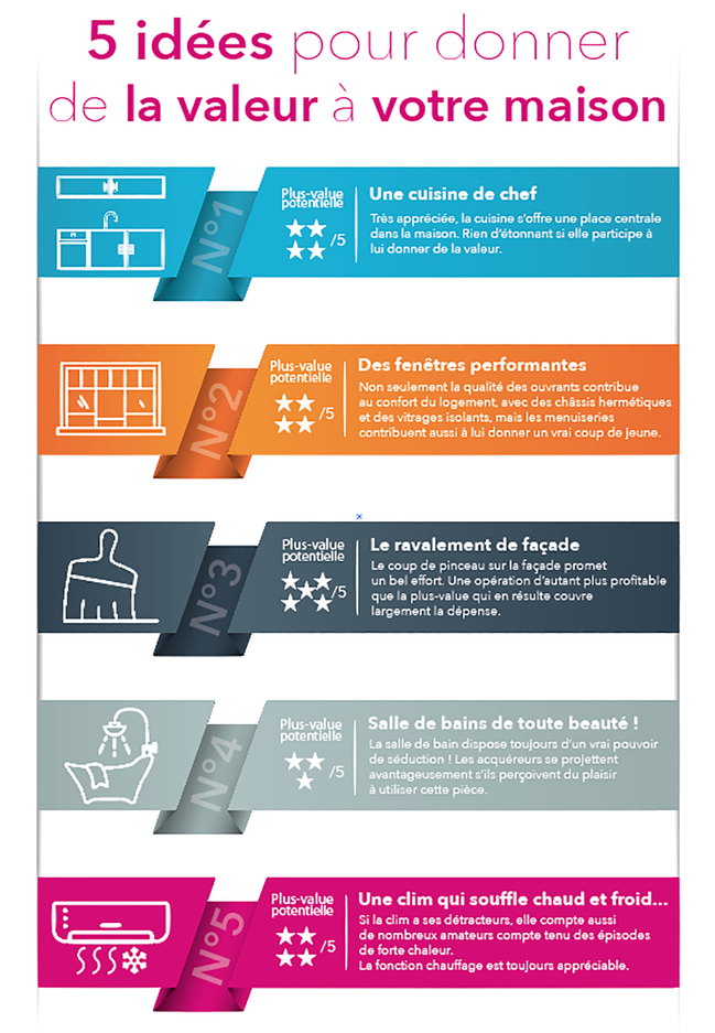 Si la clim a ses détracteurs, elle compte aussi de nombreux amateurs compte tenu des épisodes de forte chaleur. D'autant plus si la maison se voit équipée de bouches d'air frais qui alimentent chaque pièce. Si la clim réversible n'est pas indispensable, la fonction chauffage est toujours appréciable. Mais il n'est pas certain que cet équipement, encore récent et coûteux, pourra se valoriser à la revente. Il faut engager cette dépense dans l'idée de conserver son bien quelques années…