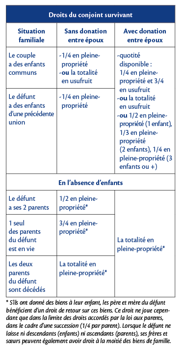 Les époux héritent automatiquement l'un de l'autre, sans droits de succession. Mais si rien n'a été prévu, la part qui revient au survivant n'est pas toujours suffisante (quantitativement, mais aussi parfois qualitativement) pour faire face à ses besoins. La donation entre époux (ou donation au dernier vivant) permet de donner une part plus importante que celle prévue par la loi. Elle peut porter sur tous les biens possédés par l'époux au jour de son décès. La part recueillie grâce à la donation entre époux varie en fonction de la composition de la famille.