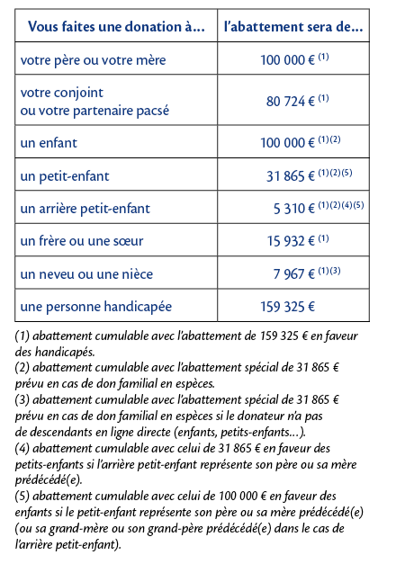 Les donations bénéficient d'une fiscalité très avantageuse. Des abattements, variables selon la personne à qui vous donnez, réduisent les droits à acquitter. Ces abattements se renouvellent tous les 15 ans. Vous pourrez donc en bénéficier plusieurs fois.