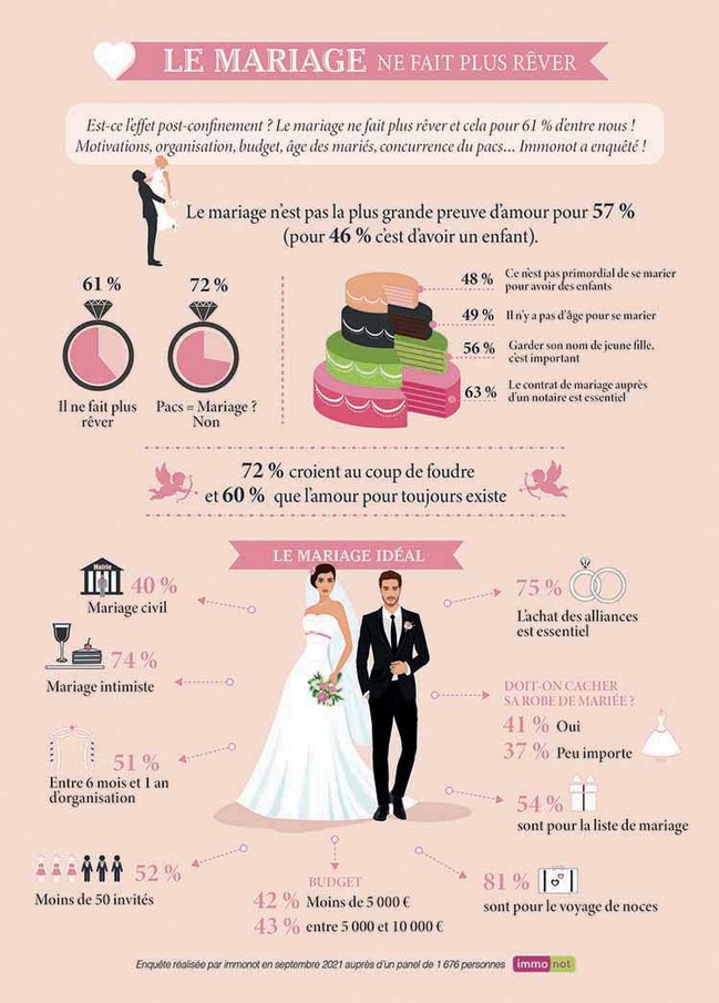 Est-ce l'effet post-confinement ? Le mariage ne fait plus rêver et cela pour 61 % d'entre nous ! Motivations, organisation, budget, âge des mariés, concurrence du pacs… Immonot a enquêté !