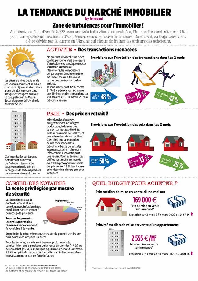 Abordant ce début d'année 2022 avec une très belle vitesse de croisière, l'immobilier semblait sur orbite pour transporter un maximum d'acquéreurs vers une nouvelle demeure. Cependant, les ardeurs des acheteurs pourraient être freinées par le contexte géopolitique, comme le pressent le panel de notaires contribuant à l'élaboration de cette tendance du marché.