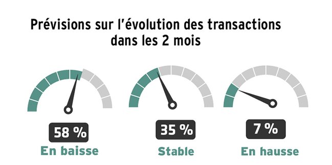 C'est probablement une des raisons pour laquelle la proportion des négociateurs à prévoir une baisse des prix passe de 32 % à 67 % pour les logements, de 46 % à 68 % pour les terrains et de 38 % à 70 % pour les commerces.